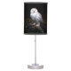 Animal portrait photograph of majestic snowy owl standing on a branch.