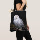 Animal portrait photograph of majestic snowy owl standing on a branch.
