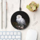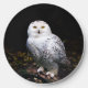 Animal portrait photograph of majestic snowy owl standing on a branch.