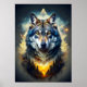 A majestic wolf with piercing eyes is depicted against a cosmic background, featuring stars and a triangular geometric shape. Below, a forest landscape is illuminated by a warm, glowing light.