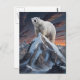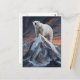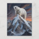 A majestic polar bear stands proudly on top of a towering mountain, its fur glistening in the sunlight against a backdrop of icy peaks and a clear blue sky.