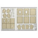 Make 2 small picture frames with this fat quarter of Zazzle fabric! This fat quarter has 10 panels of fabric laid out for each pearl / natural / ivory / cream colored photo frame, for making WASHABLE, NO SEW, FABRIC PICTURE FRAMES, for photo sizes 1 1/2" x 2 1/2" and 2 1/2" x 3 1/2" - wallet sized! AND - the smallest frame is a convertible frame, meaning you can take the strut leg pocket, that allows the frame to be tabletop, remove it from its velcro / hook & loop connections, and insert a stainless steel, bar pin back, that is removable! The back panel has velcro for the strut leg pocket at its top and a bottom right connection for the ribbon to be removed too, AND has 2 holes to hang the frame, as well as 2 vertical holes to allow for the pin back's mechanism to push through and stay in place! There is a pocket up front for the mat board OR cardboard easel back board, as well as the photo and its photo sleeve, a ACID FREE, CLEAR, SHEET PROTECTOR PAGE cut to the size of the photo! Velcro / hoko & loop is cut down & glued at the top inside between the inside front frame panel, called the 2nd inside frame front border, or 2nd Inside FFB, and the top facing frame middle panel or FM All of the fabric panels are labeled what they are, have seam allowances around the main panel parts to cut around, lines to cut along to cut away excess corner fabric, circles to indicate holes to be poked and cut out, areas marked for where to put the velcro / hook & loop - for both frames! Easel back and strut leg board patterns are ON the fabric, as well, just cut out, and transfer to mat board or cardboard. The holes on 3 of the 10 panels, for each frame, get 1/8" skinny ribbon thread through them, to connect all 3 panels, making the photo pocket. SUPPLIES NEEDED: THERMOWEB HEAT N BOND at least 1 yard x 17" wide, sold for $1.99 / yard at JoAnn Fabrics, in 1 yard pack at JoAnn, in a 5 yard roll 17" wide at Michaels or michaels.com for $8.99, make sure to use a 40% or 50% off coupon or sale to save money. It's also available at joann.com, Walmart.com Thermoweb Heat n Bond Lite OR Ultrahold - I use Ultrahold - it is acid free, perfect for this project, being that it's for photo. Heat n Bond is a paper backed, iron on, fabric glue fusbible web that gets ironed to the back of the fabric panels - it is used for your PATTERNS! Just take sheet protectors, 4 or 5, and trace over the whole panel pattern, including the seam allowance. Flip the sheet protector page pattern OR clear vinyl pattern, if you want, and transfer both the outer seam allowance line AND inner panel, onto the paper back side of the Heat n Bond. Use straight pins, poke through from the front, at all the corners, 4 corners on 6 panels, and 5 corners on the strut leg panels, flip the fabric over to the back, and center your Heat n Bond patterns, glue side down, between the pins. NOTE: For strut leg panels, make sure you trace over those 2 horizontal lines angled inside the strut leg Heat n Bond patterns. Then when you make the Heat n Bond strut leg panel patterns, cut away that center strip, BUT use it as a gauge to place the remaining top and bottom parts of the strut leg Heat n Bond patterns in place. That area where the center strip was removed will be clear of Heat n Bond, and will allow the strut leg pocket to BEND out, to pitch, for the frame to stand on a table or shelf! RIBBON: 2 lengths, 2 feet each by 1/8" wide for each frame, for connecting the 3 panels for the photo pocket 2 lengths, 9" long by 3/8" wide for each frame, for connecting the bottom right corners of the strut leg pocket, between the layers, and between the easel back, and frame middle panels, with velcro / hook & loop on the smallest frame MAT BOARD or cardboard at least a piece 6" x 4", can be bought at Michaels for $5 for 20x30" piece, 8x10" scrap for $1 at JoAnn Fabric superstores in the framing department, or AC Moore $8 for a 32x40" board - 1/16" thick hot glue sticks 15, low temp hot glue gun iron printer paper, ruler, pen or pencil paper scissors fabric scissors EMBROIDERY SCISSORS - IMPORTANT! $10 at Michaels or JoAnns, recommend Gingher brand - this will allow you to poke into those circles and cut out the holes on the 3 panels that make the photo pocket - do this AFTER you have ironed the Heat n Bond patterns to the back SHEET PROTECTOR PAGES - 50 pack, make sure the pack is labeled acid free, can be found at Walmart or Walgreens for under $4, $5 at Target STAINLESS STEEL METAL BAR STYLE PIN BACKS, PACKS OF 10, 44, 48 AT Michaels, michaels.com, AC Moore, under $4 per pack, use a store coupon or sale to save. 1 3/4" long each VELCRO / aka HOOK & LOOP white or gray, or black, 1 yard by 3/4" wide sold in JoAnn Fabrics for $1 in their notions area wall section or in their $1 bins - cut the width in half to 3/8" wide or if you can get it to 1/4" wide that's great, too, 1 1/2" long roughly - just cut a length 1 1/2" long, and cut down the middle horizontally, for both hook and loop parts, one set of strips for the photo pocket closure, the other for the attaching of the strut leg pocket to the easel back panel facing out. Then cut a square for both hook and loop 1/2" x 1/2" for joining the ribbon dangling out of the strut leg pocket to the easel back's right bottom corner, folded over twice. LEGEND: FRONT FFB: front frame front border, front of frame, with PW, or picture window - photo area, centered 2nd inside FFB: situated under front FFB, Heat n Bond ironed on side facing up, picture window inner edge hot glued to picture window edge of front FFB - has 7 holes for thread ribbon through, connecting it to the 2 FM or frame middle panels, making the photo pocket FM: frame middle, you get 2, inside facing, or TOP, and facing out, or BOTTOM - the 2nd inside FFB is connected to them on one side, the EB, or easel back panels are connected on the other side of them, for making the easel back board and pin back pocket EB: easel back panels, you get 2, one facing inside, the o