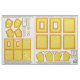 Make 2 small picture frames with this fat quarter of Zazzle fabric! This fat quarter has 10 panels of fabric laid out for each sunny yellow photo frame, for making WASHABLE, NO SEW, FABRIC PICTURE FRAMES, for photo sizes 1 1/2" x 2 1/2" and 2 1/2" x 3 1/2" - wallet sized! AND - the smallest frame is a convertible frame, meaning you can take the strut leg pocket, that allows the frame to be tabletop, remove it from its velcro / hook & loop connections, and insert a stainless steel, bar pin back, that is removable! The back panel has velcro for the strut leg pocket at its top and a bottom right connection for the ribbon to be removed too, AND has 2 holes to hang the frame, as well as 2 vertical holes to allow for the pin back's mechanism to push through and stay in place! There is a pocket up front for the mat board OR cardboard easel back board, as well as the photo and its photo sleeve, a ACID FREE, CLEAR, SHEET PROTECTOR PAGE cut to the size of the photo! Velcro / hoko & loop is cut down & glued at the top inside between the inside front frame panel, called the 2nd inside frame front border, or 2nd Inside FFB, and the top facing frame middle panel or FM All of the fabric panels are labeled what they are, have seam allowances around the main panel parts to cut around, lines to cut along to cut away excess corner fabric, circles to indicate holes to be poked and cut out, areas marked for where to put the velcro / hook & loop - for both frames! Easel back and strut leg board patterns are ON the fabric, as well, just cut out, and transfer to mat board or cardboard. The holes on 3 of the 10 panels, for each frame, get 1/8" skinny ribbon thread through them, to connect all 3 panels, making the photo pocket. SUPPLIES NEEDED: THERMOWEB HEAT N BOND at least 1 yard x 17" wide, sold for $1.99 / yard at JoAnn Fabrics, in 1 yard pack at JoAnn, in a 5 yard roll 17" wide at Michaels or michaels.com for $8.99, make sure to use a 40% or 50% off coupon or sale to save money. It's also available at joann.com, Walmart.com Thermoweb Heat n Bond Lite OR Ultrahold - I use Ultrahold - it is acid free, perfect for this project, being that it's for photo. Heat n Bond is a paper backed, iron on, fabric glue fusbible web that gets ironed to the back of the fabric panels - it is used for your PATTERNS! Just take sheet protectors, 4 or 5, and trace over the whole panel pattern, including the seam allowance. Flip the sheet protector page pattern OR clear vinyl pattern, if you want, and transfer both the outer seam allowance line AND inner panel, onto the paper back side of the Heat n Bond. Use straight pins, poke through from the front, at all the corners, 4 corners on 6 panels, and 5 corners on the strut leg panels, flip the fabric over to the back, and center your Heat n Bond patterns, glue side down, between the pins. NOTE: For strut leg panels, make sure you trace over those 2 horizontal lines angled inside the strut leg Heat n Bond patterns. Then when you make the Heat n Bond strut leg panel patterns, cut away that center strip, BUT use it as a gauge to place the remaining top and bottom parts of the strut leg Heat n Bond patterns in place. That area where the center strip was removed will be clear of Heat n Bond, and will allow the strut leg pocket to BEND out, to pitch, for the frame to stand on a table or shelf! RIBBON: 2 lengths, 2 feet each by 1/8" wide for each frame, for connecting the 3 panels for the photo pocket 2 lengths, 9" long by 3/8" wide for each frame, for connecting the bottom right corners of the strut leg pocket, between the layers, and between the easel back, and frame middle panels, with velcro / hook & loop on the smallest frame MAT BOARD or cardboard at least a piece 6" x 4", can be bought at Michaels for $5 for 20x30" piece, 8x10" scrap for $1 at JoAnn Fabric superstores in the framing department, or AC Moore $8 for a 32x40" board - 1/16" thick hot glue sticks 15, low temp hot glue gun iron printer paper, ruler, pen or pencil paper scissors fabric scissors EMBROIDERY SCISSORS - IMPORTANT! $10 at Michaels or JoAnns, recommend Gingher brand - this will allow you to poke into those circles and cut out the holes on the 3 panels that make the photo pocket - do this AFTER you have ironed the Heat n Bond patterns to the back SHEET PROTECTOR PAGES - 50 pack, make sure the pack is labeled acid free, can be found at Walmart or Walgreens for under $4, $5 at Target STAINLESS STEEL METAL BAR STYLE PIN BACKS, PACKS OF 10, 44, 48 AT Michaels, michaels.com, AC Moore, under $4 per pack, use a store coupon or sale to save. 1 3/4" long each VELCRO / aka HOOK & LOOP white or gray, or black, 1 yard by 3/4" wide sold in JoAnn Fabrics for $1 in their notions area wall section or in their $1 bins - cut the width in half to 3/8" wide or if you can get it to 1/4" wide that's great, too, 1 1/2" long roughly - just cut a length 1 1/2" long, and cut down the middle horizontally, for both hook and loop parts, one set of strips for the photo pocket closure, the other for the attaching of the strut leg pocket to the easel back panel facing out. Then cut a square for both hook and loop 1/2" x 1/2" for joining the ribbon dangling out of the strut leg pocket to the easel back's right bottom corner, folded over twice. LEGEND: FRONT FFB: front frame front border, front of frame, with PW, or picture window - photo area, centered 2nd inside FFB: situated under front FFB, Heat n Bond ironed on side facing up, picture window inner edge hot glued to picture window edge of front FFB - has 7 holes for thread ribbon through, connecting it to the 2 FM or frame middle panels, making the photo pocket FM: frame middle, you get 2, inside facing, or TOP, and facing out, or BOTTOM - the 2nd inside FFB is connected to them on one side, the EB, or easel back panels are connected on the other side of them, for making the easel back board and pin back pocket EB: easel back panels, you get 2, one facing inside, the other facing out, with the s