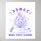 Celestial poster print features purple moon phases with enchanted hand holding a cluster of crystals and "Make today magical" text.