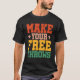 My 11 yo wore adult XL (5’7” 165#). The 8yo is small framed. She wore adult small and tied it in the back. Grandma wore adult large with long sleeve shirt underneath. Tall girl adult medium. Dark haired male adult large. Good quality dark Heather gray, Gildan brand shirt. -it was next up from basic choice and cost about $20 per shirt. Not too thick or thin. Washed and dried well, no major shrinkage. Not see-through. Can wear a bra under it fine. Screen print is just as shown and well done, front and back.