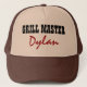 Make your own personalized grill master BBQ Trucker Hat . Funny birthday party gift idea for guys who love barbecue grilling and cooking outdoors. Buy one for chef dad, uncle, husband, grandpa, brother etc. Humorous barbecue king caps in white, beige and yellow. Manly design with cool western style cowboy letters. Personalize with name of friend or family. ie Dylan, Frank, Jim, Robert etc. Matching aprons available too.