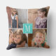 Make your own photo collage and monogram personalized Throw Pillow. This modern pillow displays a collage of four family photos and your monogram on the front and four different photos on the back. In the center there is an aqua blue frame with your monogram. Just change images and monogram to create your own! Photography © Storytree Studios, Stanford, CA