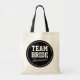 Custom Team Bride tote bags for wedding party. Personalizable with name. Cute gift idea for bride, bridesmaids, maid of honor, mom, sister, friends etc. Round emblem badge design for wedding party, bridal shower, bachelorette girls night out. Elegant script letters. Black and white colors.