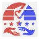 This design features a circular design with striped and colorful shapes, a handshake prominently displayed at the bottom, a ballot shape in the middle with a check mark icon created as negative space, and five arranged stars at the center.
