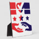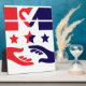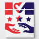 This design features a circular design with striped and colorful shapes, a handshake prominently displayed at the bottom, a ballot shape in the middle with a check mark icon created as negative space, and five arranged stars at the center.