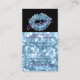 Makeup artist business card featuring glamorous blue lipstick kiss with glittery zebra stripes and white sparkles over elegant black and light blue glitter bokeh background. This stylish profile card is perfect for beauticians, cosmetologists, hair and makeup beauty salon owners and others in the beauty industry. If you need any help with this design, feel free to contact me.