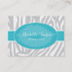 Makeup artist business cards designed with a zebra pattern name emblem you can personalize and second side printing included with your company contact and details. Designed for a makeup professional artist cosmetics sales reps, or beauty experts.