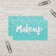 A modern, stylish makeup artist business card with modern hand lettering style brush typography in white on a teal faux glitter and turquoise teal trendy and elegant background.