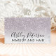 An elegant modern, stylish makeup artist and hair stylist business card with elegant modern simple hand lettering style typography in white on a faux lavender purple lilac glitter and white marble trendy and elegant background. all text is customizable, add your social media.