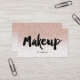 A modern, stylish makeup artist business card with modern hand lettering style brush typography in black on an elegant faux rose gold glitter ombre and chevron stitch pattern. The white background color is fully customizable