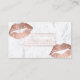 An elegant modern, stylish and simple makeup artist business card with elegant script hand lettering style typography with faux rose gold frame and lips on a modern white marble background. A simple and professional design