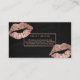 An elegant modern, stylish and simple makeup artist business card with elegant script hand lettering style typography with faux rose gold frame and lips on black chalkboard background. A simple and professional design