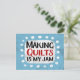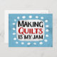 "Making Quilts Is My Jam" is a cute text design in blue with black and red text, along with a white accent shape and white textured whimsical dots surrounding it.