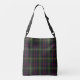 Colorful plaid cross over body bag done in the traditional dark blue, green, red, yellow, and sky blue clan Malcolm tartan pattern. A red single letter monogram, on the front of the bag, is ready to personalize. Great all purpose tote.