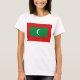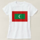 The front of this t-shirt boldly displays the Maldivian flag with its distinctive white crescent over a green rectangle over a red rectangle. This is matched at the back by an attractive map of Maldives.