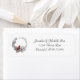 This address label design features a beautiful red male cardinal perched on a black and white wreath made of pine branches, twigs, winter berries and flowers.