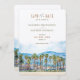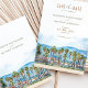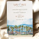 This gorgeous save-the-date card captures the laid-back elegance of Malibu, California, with a stunning watercolor illustration featuring tall palm trees against a backdrop of rolling hills and blue skies. The soft watercolor tones of sea blue, sandy beige, and lush green evoke the relaxed vibe of a beachside celebration, perfect for a destination wedding or a coastal-themed event.