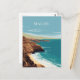 Stunning graphic illustration of the Malibu coast, featuring dramatic brown cliffs, a small sandy beach, and vibrant turquoise ocean water under a clear blue sky.