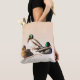 This tote bag features features an artistic rendering of three Mallard Ducks perched on a pale orange gradient background. The male ducks can be identified by their iridescent green heads and yellow beaks. The females have lovely feathers in shades of brown and gold with orange beaks. The image is repeated on the back.