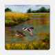 Male and female mallard ducks in flight over a golden pond, water rippling to reflect the colors of the background autumn foliage glowing in the sunlight. Realistic artwork created from an original oil painting by wildlife artist Crista S. Forest.