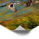 Male and female mallard ducks in flight over a golden pond, water rippling to reflect the colors of the background autumn foliage glowing in the sunlight. Realistic artwork created from an original oil painting by wildlife artist Crista S. Forest.