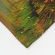 Male and female mallard ducks in flight over a golden pond, water rippling to reflect the colors of the background autumn foliage glowing in the sunlight. Accented with a matching teal green background.