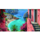 This poster vividly depicts Mallorca’s charm with its striking pink houses that dot the coastline, offering a pop of color against the azure sea and verdant hills. The dramatic mountains rise majestically in the background, creating a breathtaking contrast that highlights the island's natural splendor.