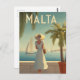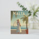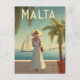 This charming vintage poster features a stylish woman in a classic 1950s dress strolling along a sunny promenade in Malta. Behind her, the Mediterranean sparkles and traditional Maltese architecture lines the waterfront. Soft retro textures and warm tones evoke the timeless elegance of mid-century coastal life on the island. A perfect piece for fans of vintage fashion, seaside charm, and nostalgic European travel art.