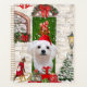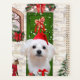 Maltese Dog Christmas sitting outside decorated home with Christmas wreath, Christmas tree is a perfect Christmas gift idea for dog lovers.