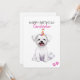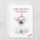Happy Birthday with a personalized name. A cute white Maltese puppy dog illustration with a birthday hat and balloons. Add your own message for a personal unique card. Art made with watercolors.