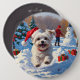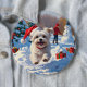 A fluffy Maltese joyfully runs through the snowy landscape, wearing a festive red Christmas hat. This charming winter scene highlights the breed’s silky coat, playful personality, and cheerful spirit while capturing the warmth and magic of the holiday season. A delightful design filled with festive charm.