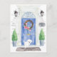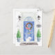 Announce your new address with our stylish announcement featuring a Maltese, blue front door, welcome mat, slate sign, topiaries and a floral wreath set on a gray brick background.