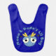 A cute bib for babies and toddlers features a blue bug with antennas, wings, and big eyes with blue text that reads Mama and Dada's Lil Bug on a bright blue background.