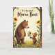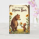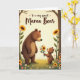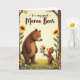 This card shows two cuddly bear-like characters sharing a sweet moment in a sunlit woodland, with a larger brown bear on the left leaning in with a tender, protective look toward a smaller bear on the right ❤️. The smaller bear stands upright and offers a bouquet of bright yellow sunflowers, held out like a shy but loving thank-you. Behind them, a creamy yellow sky suggests late-day warmth, softly lighting their rounded faces and gentle expressions. Tall, stylized trees with sparse branches rise on both sides in deep brown tones, framing the pair like a quiet stage. Across the top, the message “To a very special Mama Bear” sits centered in flowing lettering, with the words in a dark tone that stands out against the light sky, and a few tiny red hearts tucked beneath it. At their feet, green grass spreads across the foreground, dotted with daisies, sunflowers, and small pink blossoms 🌼. The bears’ smooth fur shading and the flower petals’ fine details give the scene a cozy, close-up feel. A scattering of wildflowers runs from the lower left corner toward the lower right, mixing white, yellow, and pink blooms among the grass.
