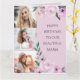 Say Happy Birthday to your beautiful mama with a pretty floral photo card. This birthday card can be personalized with 3 of your favorite photos and you can also edit the wording on the front and the message inside. It currently reads "Happy Birthday to our Beautiful Mama" and you can edit this to Amazing Aunt or whatever you wish. A pretty design with elegant typography and watercolor flowers in shades of pink on a pink background.