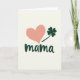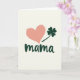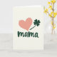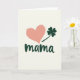 This design shows the word “mama” in deep forest green lettering placed low and centered on a creamy off-white background, giving the layout plenty of quiet space to breathe. Above and a little to the left sits a salmon-pink heart with visible brushstrokes, like a soft painted mark left by someone who cares. From the heart’s right side, a thin green stem curves upward in a gentle arc, leading the eye as if guiding a fond glance. At the top of that curve is a four-leaf clover in the same rich green as the “mama” text, adding a small touch of luck ☘️. The heart and clover look slightly textured rather than sharply digital, which makes the pairing feel more intimate, like a small token shared between close friends or family 💚. The colors stay calm and warm—pink against green—so the design feels tender without needing extra decoration. The clover sits above the heart on the right side, with the stem connecting them in a smooth, upward sweep.
