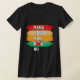 My overall review is that the T-shirt is nice, it fits true to size however the font is significantly smaller than advertised and you can't read it. The printing is unreadable and there is a strain to read it. It does not look like the advertised product. Maybe the shirt color is darker or a larger more visible font should have been used. Photos with and without flash and font is barely legible.