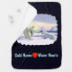 A polar bear cub seeks reassurance from its mother on the arctic ice pack. Text reading "Cold Noses Warm Hearts" and a red heart also appear. All on a starry background.