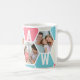 Honeycomb coffee mug, personalized with 5 of your favorite photos and printed with a 5 letter name, such as MAMAW. The design features a honeycomb photo collage in a pretty color palette of summer blue pink and alabaster, with a cute little bee. If you want to change the colors, click "customize further" and click each hexagon that you want to change.