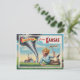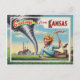 Whimsical retro postcard of a man and a tornado with the message Greetings From Kansas