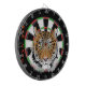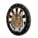 This dart board features a orange black and white tiger with yellow eyes .There is a bright beautiful text in orange that says man cave.With black back ground. Back ground color can be change.This Realistic artwork is great for someone who loves to hunt, hunting guide or lodge, sportsman, outdoors man or animal lover or pup or bar.