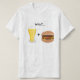 Beer plus double cheeseburger makes a happy man (or woman)! This t-shirt shows a tall glass of frothy beer and a hamburger with double burgers, melting cheese, tomato rings and gherkin garnish.