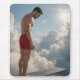 A man in bright red shorts stands boldly on a diving board high among the clouds, bathed in warm sunlight that enhances the sense of exhilaration and serenity