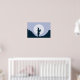 A graphic poster with an illustration of a silhouette of a man wearing a kilt and playing bagpipes in the moonlight. The background is a rocky terrain, all in a Scottish dreamy atmosphere. This wall art will be perfect for home or office decoration.