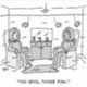 Cartoon shows a couple sitting in their flooded lounge, wearing deep sea diving suits. Their tropical fish are swimming around them. The man's wife says "You spoil those fish".